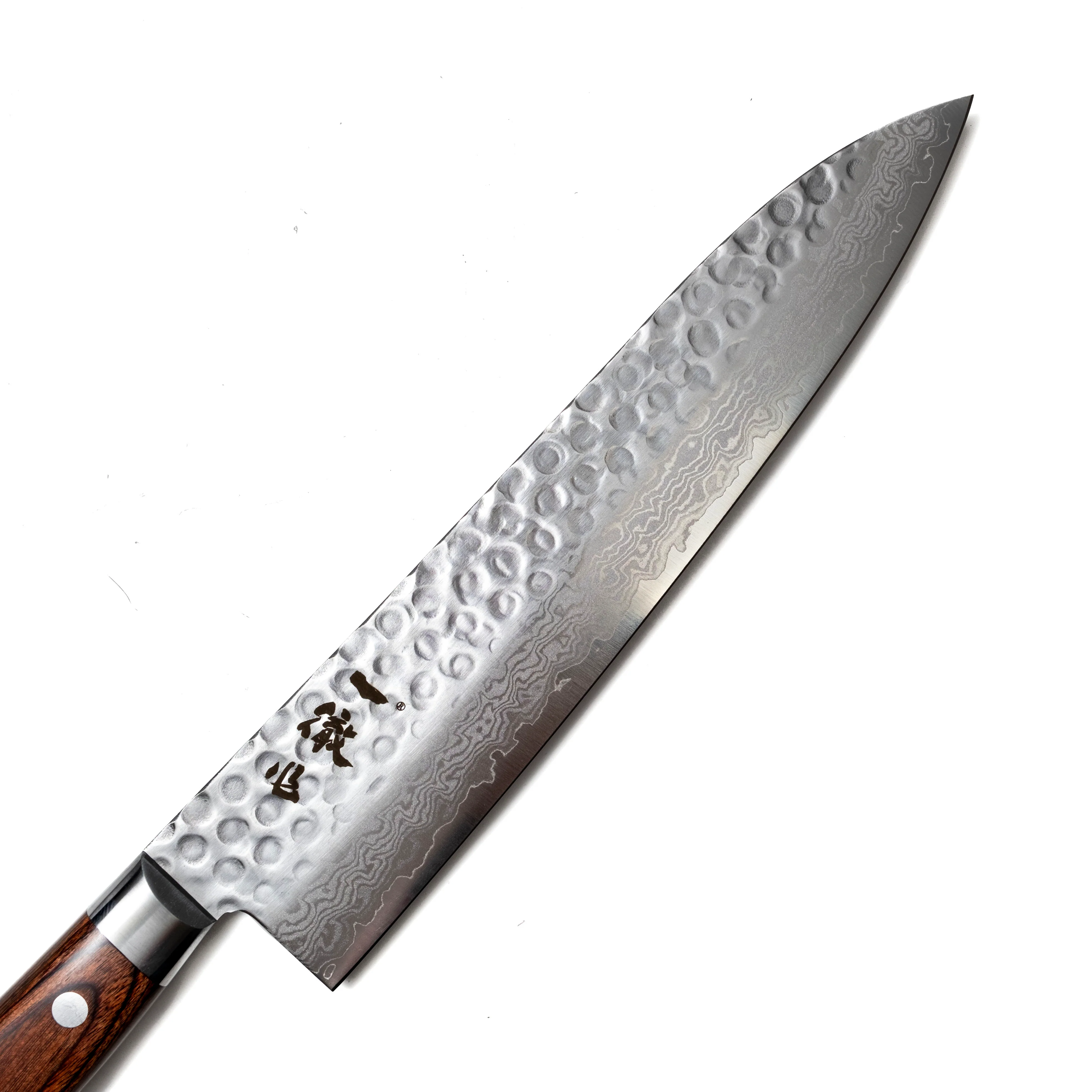 This is a fantastic starter Gyuto for the home cook or professional chef looking for an easy to maintain, high performing and good looking chefs knife. The VG-10 steel won't rust or discolour even if it's not wiped down immediately after use and it has very good edge retention. The wavy damascus pattern blends beautifully with the tsuchime "hand hammered" finish and is further complemented by the brown pakka wood handle. The triple riveted handle ensures this knife will stand up to the toughest kitchen conditions and is comfortable to grip.