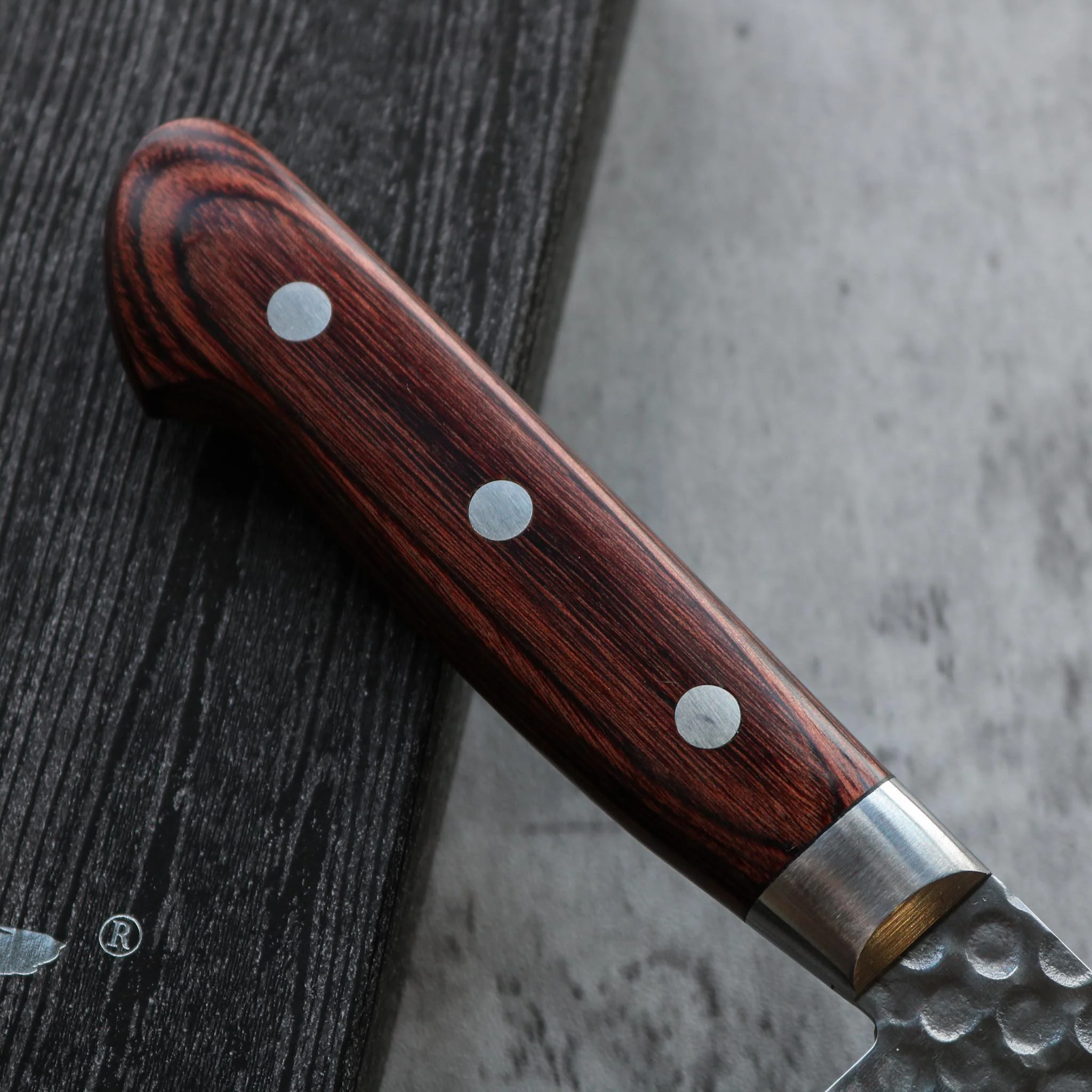 This is a fantastic starter Nakiri for the home cook or professional chef looking for an easy to maintain, high performing and good looking vegetable knife. The VG-10 steel won't rust or discolour even if it's not wiped down immediately after use and it has very good edge retention. The tsuchime "hand hammered" finish is well complemented by the brown pakka wood handle and the triple riveted handle ensures this knife will stand up to the toughest kitchen conditions and is comfortable to grip.