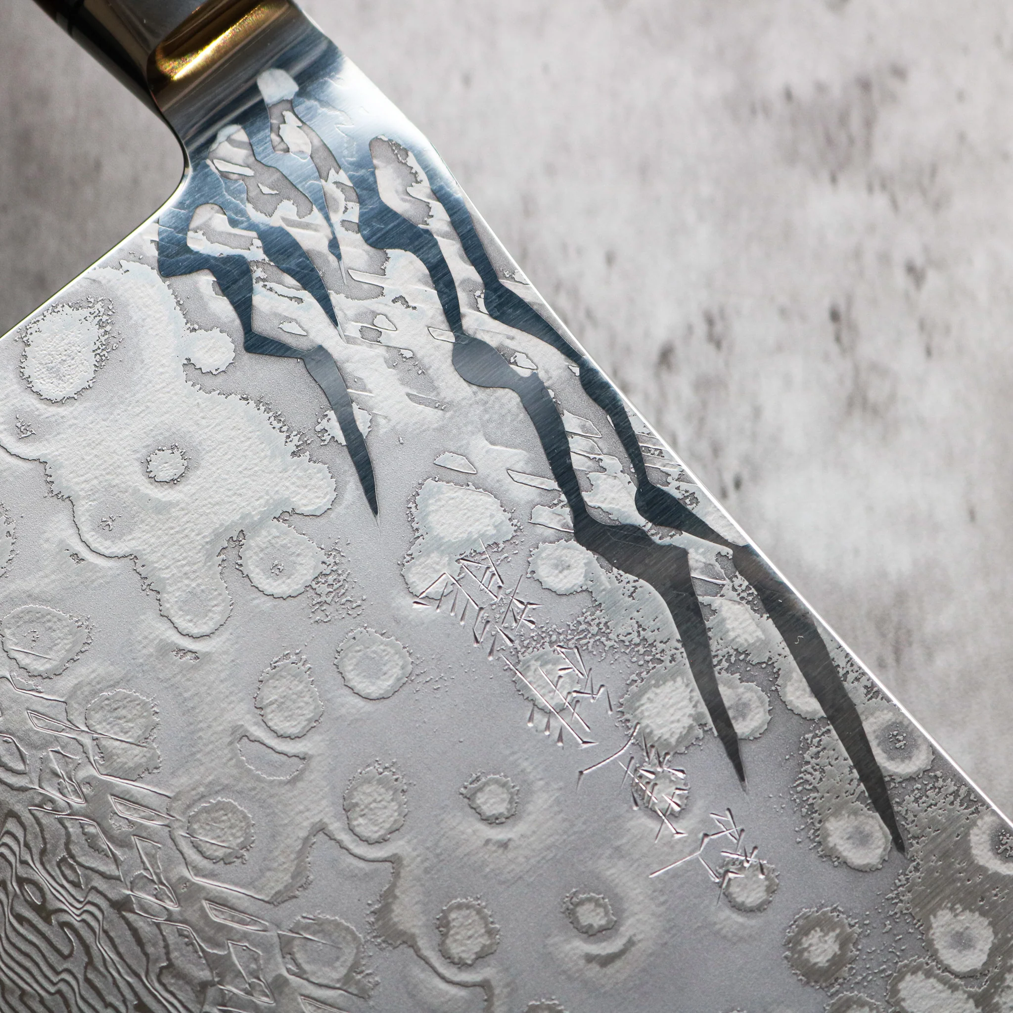 The shimmering pattern at the boundary between the blade and the handle is applied by hand by craftsmen one by one, and is inspired by flames (blazes) that express the maker's passion for craftsmanship and the user's passion for cooking."